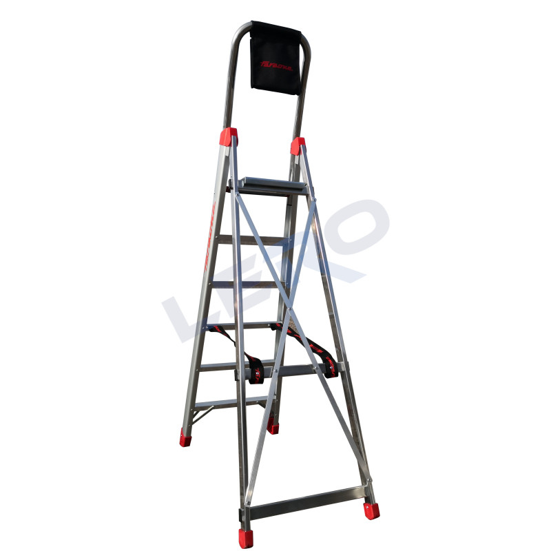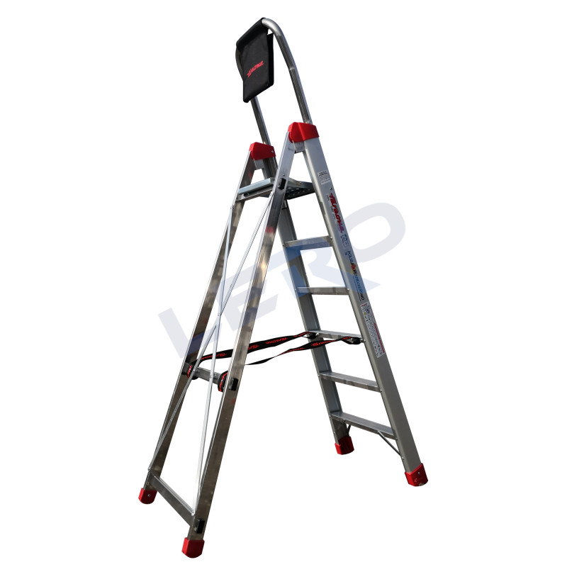 Drabina FARAONE LADY to model składany, który został wykonany niemal w całości z aluminium. Dzięki temu drabinę można łatwo przenosić i rozstawiać w dowolnym miejscu. Sporym ułatwieniem jest znajdujący się na szczycie drabiny pałąk, na któryś można zawiesić np.torbę z narzędziami. Gumowe nóżki antypoślizgowe mogą zostać łatwo wymienione na nowe po ich zużyciu.