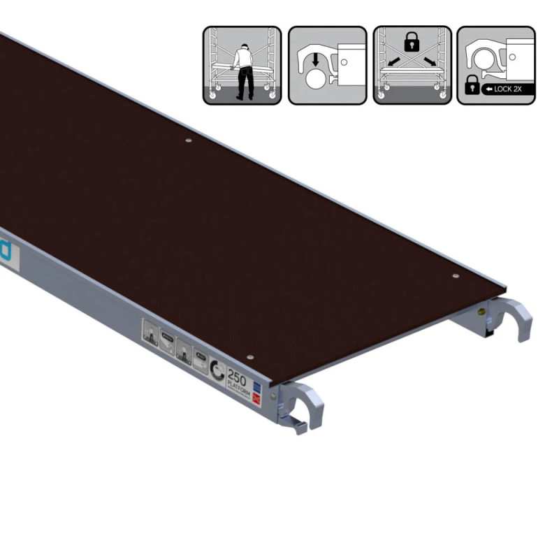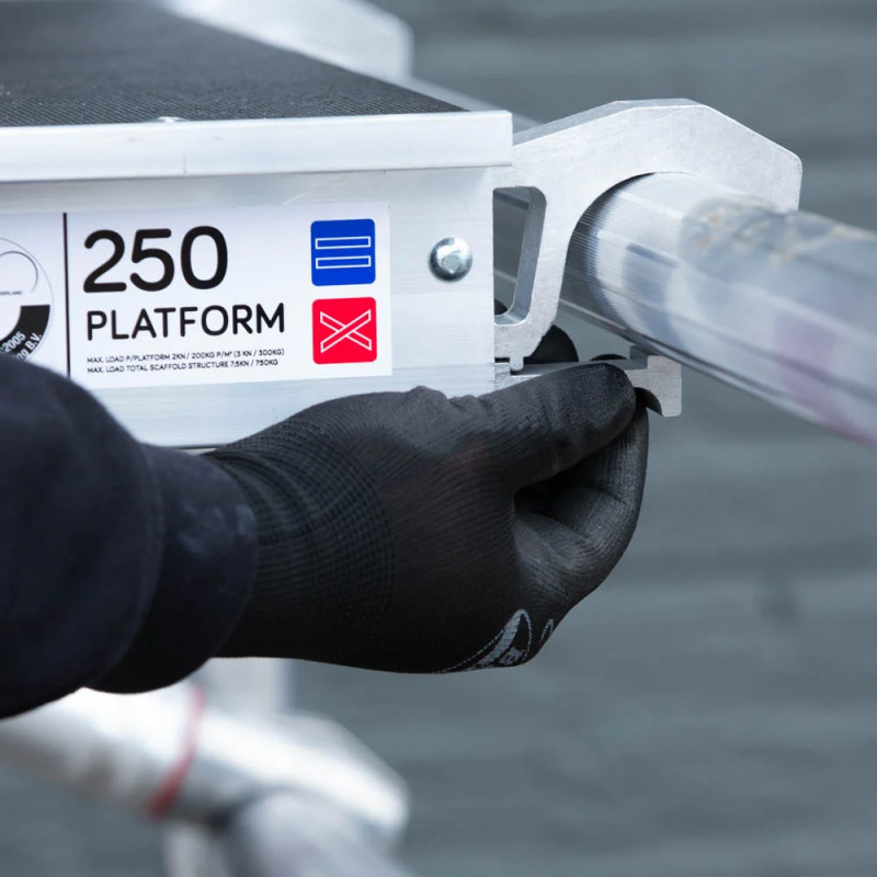 Podesty robocze są wyłożone sklejką antypoślizgową, każdy podest posiada klapę umożliwiającą wejście na rusztowanie